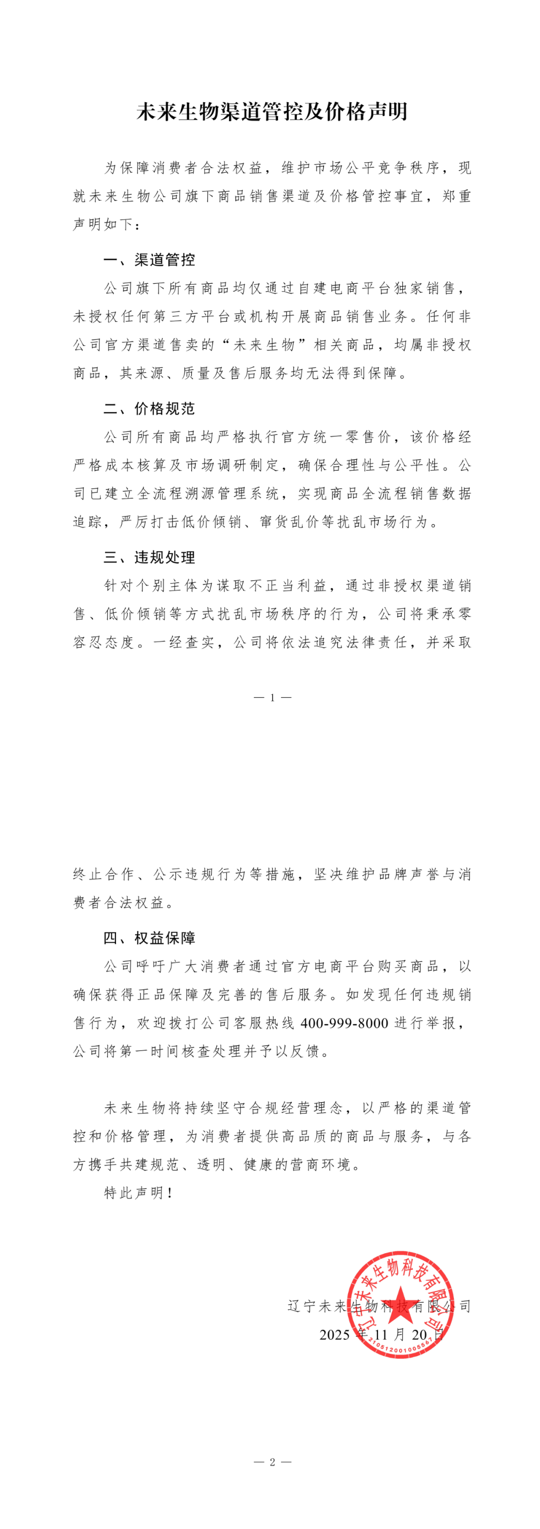 为保障消费者合法权益,维护市场公平竞争秩序,现就未来生物公司旗下商品销售渠道及价格管控事宜,郑重声明如下: