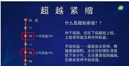 2·超越奖励:在传统模式下当下级成员超过上级时上级通常无法受益,但该系统中即使下属超过上级,上级仍可通过紧缩机制获得平等收入。例如,V5 级别成员的直接推荐人是 V6 级别成员,但团队深度出现 V5 级别成员,该 V5 级别成员也将被视作第一代下线,第二代下线同理。